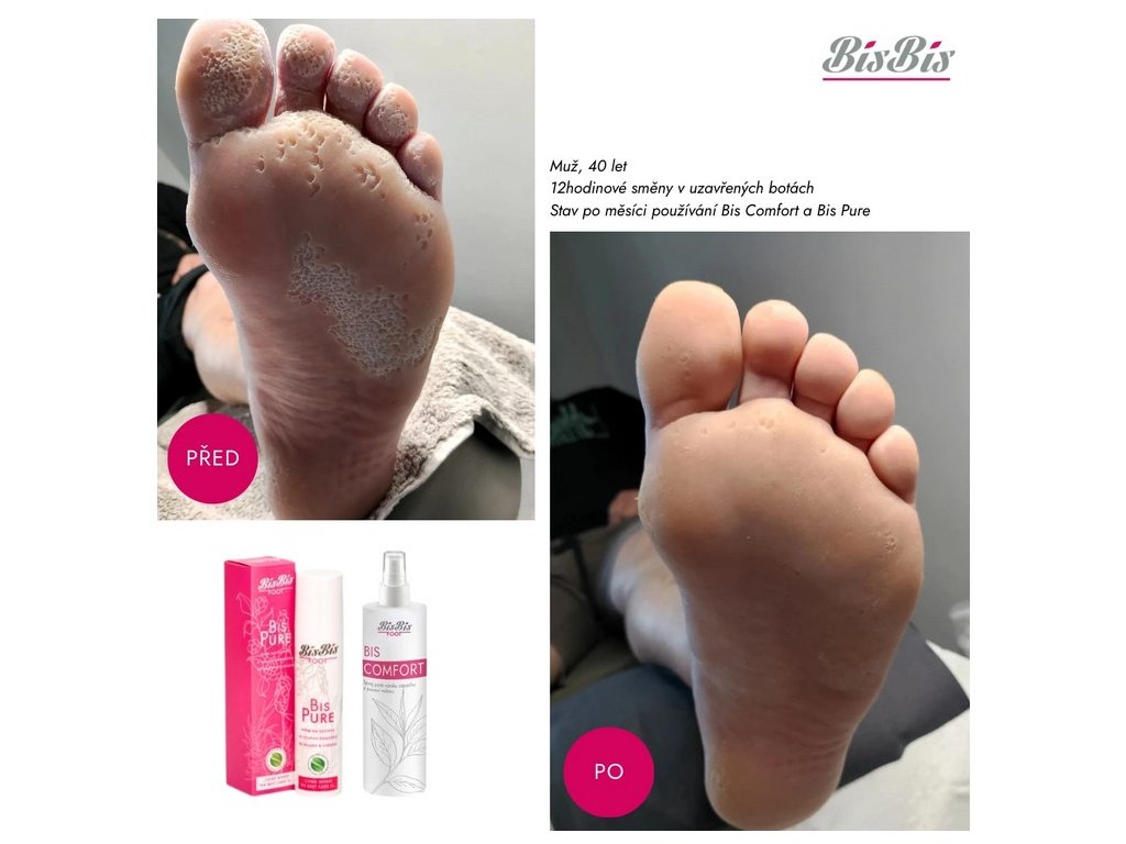 Petra trápila suchá kůže, praskliny, dokonce i nepříjemný zápach, pravidelně pracoval 12 hodin v uzavřených botách. Pedikérka doporučila Bis Comfort v kombinaci Bis Pure, výsledek po měsíci používání vás překvapí.